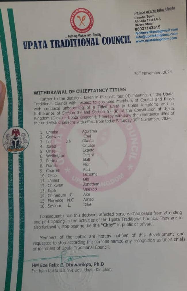 The statement signed by his Majesty withdrawed chieftaincy titles from Emeka Agwama, Godwin Ossai, Lot Okodu, Jared Onuabi, Orisa Ekpete, Wellington Ojigini, Pedro Alali, Daniel Aloni, Charles Apia, Osco Ochoma, James Olo, Chikwem Johnathan, Ikpe Unekpo, Chinedu Ake, Florence Amadi and Savior Dike for conducts it termed as unbecoming.